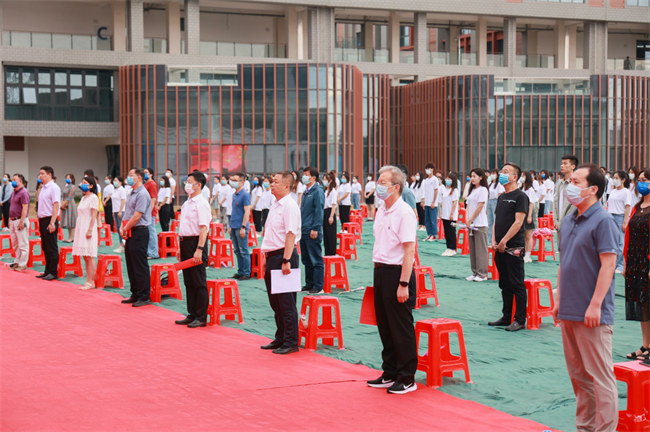 雄壯激昂的國(guó)歌聲起,全體人員靜穆肅立,齊唱國(guó)歌,在莊重?zé)崃业臍夥罩,典禮正式開始。