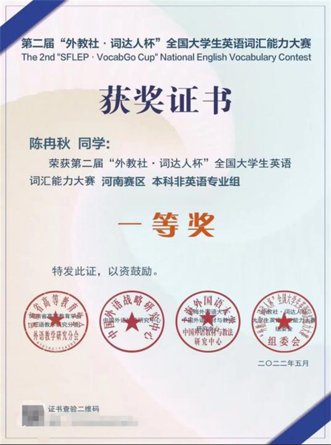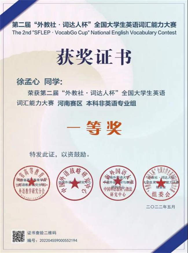 該賽事是由中國外語戰(zhàn)略研究中心、中國外語教材與教法研究中心和上海外語教育出版社舉辦的全國性大學生英語賽事,分為校賽、省賽、全國決賽三個階段。在剛剛結束的第二屆競賽中,來自30個省市自治區(qū)近900所高校的134萬余位同學參賽。賽前,鄭州升達經貿管理學院基礎部大學英語教師對參賽學生進行了悉心指導,幫助學生在省賽及全國決賽中屢創(chuàng)佳績,助力學生成長成才。經過激烈角逐,最終金貿學院兩位學子榮獲河南賽區(qū)本科非英語專業(yè)組一等獎。