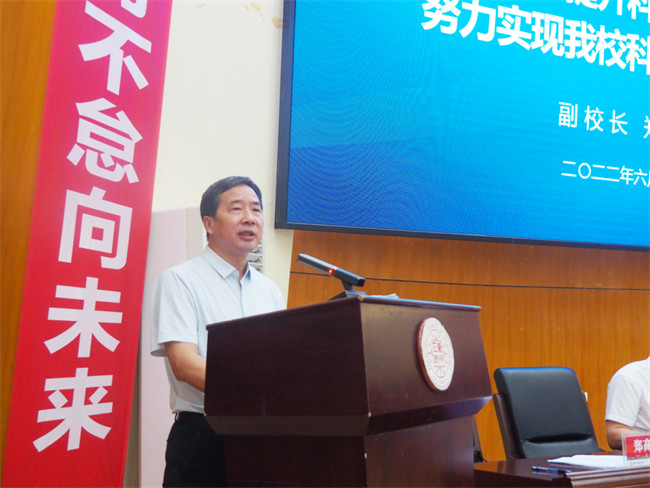 副校長鄭高飛作了題為《進(jìn)一步提升科技創(chuàng)新能力 努力實(shí)現(xiàn)我校科研工作新跨越》的科技工作報(bào)告,報(bào)告總結(jié)了學(xué)校2021年的科技工作取得的成績,對下一階段的工作進(jìn)行了具體安排。報(bào)告指出,全體師生員工要聚集力量,敢為人先,追求卓越,努力探索科學(xué)前沿,發(fā)現(xiàn)和解決新的科學(xué)問題,攻堅(jiān)克難,進(jìn)一步提升科技創(chuàng)新能力,推動(dòng)特色應(yīng)用型本科建設(shè),為地方經(jīng)濟(jì)社會(huì)發(fā)展貢獻(xiàn)“鄭工智慧”。