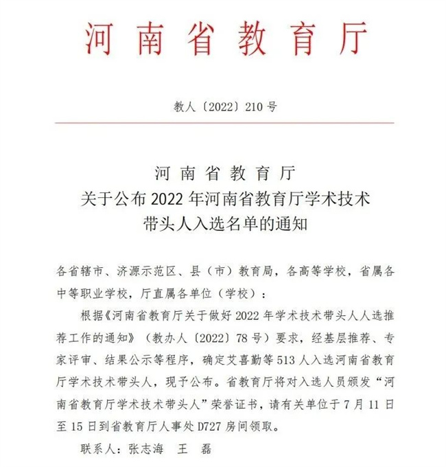 中新河南網(wǎng)7月5日電 近日,河南省教育廳發(fā)布了《關(guān)于公布2022年河南省教育廳學(xué)術(shù)技術(shù)帶頭人入選名單的通知》(教人〔2022〕210號(hào)),鄭州工程技術(shù)學(xué)院外國(guó)語學(xué)院(國(guó)際教育學(xué)院)王麗麗老師和信息工程學(xué)院朱志甫博士榮獲“2022年河南省教育廳學(xué)術(shù)技術(shù)帶頭人”稱號(hào)。