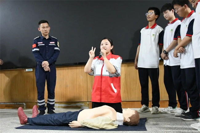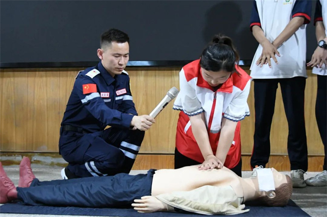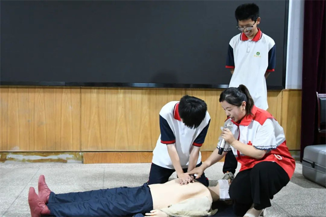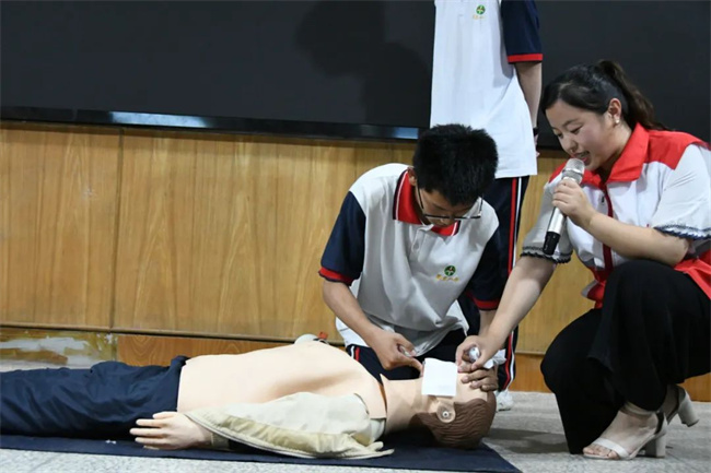 縣紅十字會(huì)應(yīng)急救護(hù)培訓(xùn)講師王慧丹,用通俗易懂的語(yǔ)言為師生講解急救知識(shí)和技能,重點(diǎn)講解了心肺復(fù)蘇的流程和注意事項(xiàng)。通過實(shí)際操作演練,用人體模型給大家演示心肺復(fù)蘇的整體操作流程,如何打開氣道、做人工呼吸、定位按壓、檢查呼吸等環(huán)節(jié)。學(xué)生們爭(zhēng)先恐后,都想體驗(yàn)下救助過程,縣紅十字會(huì)應(yīng)急救護(hù)培訓(xùn)師王慧丹耐心講解,師生們仔細(xì)聆聽,不斷鞏固操作要領(lǐng),通過心肺復(fù)蘇實(shí)操演示,真正掌握了正確的急救方法,做好校園意外傷害和突發(fā)事件的應(yīng)急處理,助力平安校園建設(shè)。并指導(dǎo)學(xué)生們進(jìn)行現(xiàn)場(chǎng)演練,在有限的時(shí)間內(nèi)向全校師生有效普及急救技能,收到良好的培訓(xùn)效果。