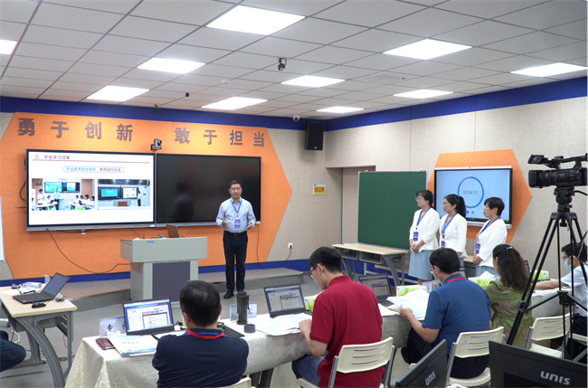 現(xiàn)場(chǎng)決賽階段,參賽選手在賽事說(shuō)明會(huì)上抽簽決定比賽場(chǎng)次和時(shí)間。現(xiàn)場(chǎng)決賽分為教學(xué)實(shí)施報(bào)告介紹、無(wú)學(xué)生教學(xué)展示和答辯等三個(gè)環(huán)節(jié),各參賽選手沉著冷靜、精神飽滿、思路清晰、聲情并茂,展示了扎實(shí)的教學(xué)基本功和精湛的教學(xué)藝術(shù)。各參賽團(tuán)隊(duì)答辯機(jī)智敏捷、從容應(yīng)對(duì),展示了良好的精神風(fēng)貌和默契的團(tuán)隊(duì)配合,現(xiàn)場(chǎng)氣氛嚴(yán)肅活潑,生動(dòng)熱烈。