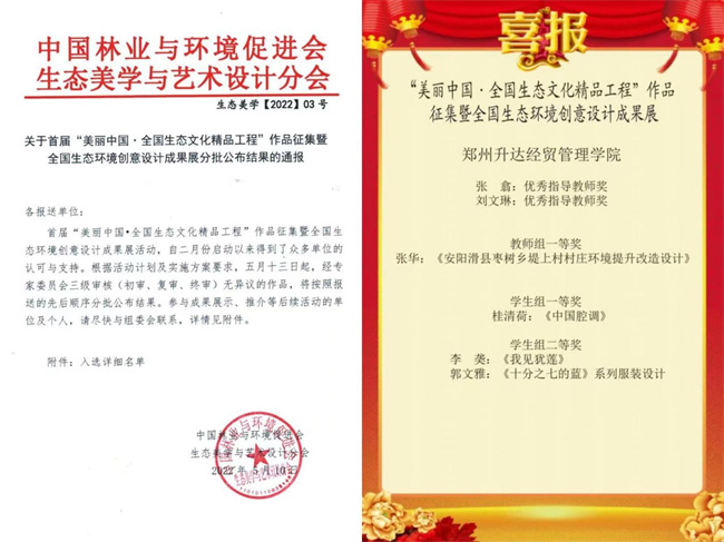 中新河南網(wǎng)7月21日電(張華 陳藝楠) 近日,在首屆“美麗中國·全國生態(tài)文化精品工程”作品征集暨全國生態(tài)環(huán)境創(chuàng)意設(shè)計成果展活動中,經(jīng)專家委員會審核,鄭州升達經(jīng)貿(mào)管理學院藝術(shù)學院教師張華獲得教師組一等獎,張翕、劉文琳獲得優(yōu)秀指導教師獎;桂清荷獲得學生組一等獎,李䶮、郭文雅分別獲得學生組二等獎。
