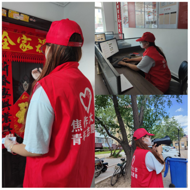 信息工程學(xué)院21級軟件技術(shù)一班張斯諾返鄉(xiāng)后第一時(shí)間投入到內(nèi)蒙古赤峰市元寶山區(qū)平莊鎮(zhèn)的疫情防控工作中,按照疫情防控常態(tài)化的要求,用實(shí)際行動(dòng)為打贏疫情防控阻擊戰(zhàn)貢獻(xiàn)志愿力量。作為一名青年志愿者,她始終把志愿者精神牢記在心,在志愿活動(dòng)中認(rèn)真負(fù)責(zé),盡力服務(wù),向社會展現(xiàn)出焦作大學(xué)青年志愿者的風(fēng)采。“此次社會實(shí)踐活動(dòng)讓我感觸很多,真正理解了‘從群眾中來,到群眾中去’的內(nèi)在涵義,認(rèn)識到只有把個(gè)人的命運(yùn)同社會、同國家的命運(yùn)聯(lián)系起來,才是青年成長的正確之路。”她說道。