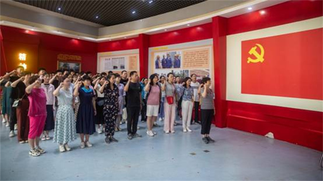 在史來(lái)賀紀(jì)念館,面對(duì)鮮紅的黨旗,該學(xué)院黨委書(shū)記王霄鸝領(lǐng)誓,其他同志舉起右手、握緊拳頭,重溫了入黨誓詞,以堅(jiān)定有力的宣誓聲,表達(dá)了“不忘初心、牢記使命”的信念和決心。