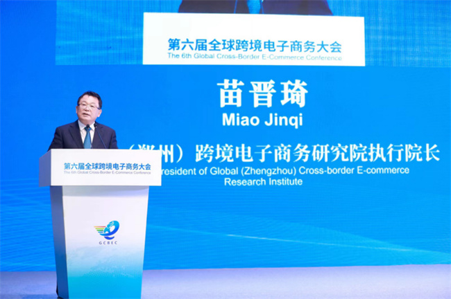 鄭州職業(yè)技術(shù)學院黨委書記苗晉琦在跨境電子商務(wù)高峰會上發(fā)表講話,并代表全球(鄭州)跨境電商研究院發(fā)布《中國跨境電商發(fā)展報告(2022)》(中國跨境電商藍皮書),宣布“金磚國家跨境電子商務(wù)職業(yè)教育聯(lián)盟”成立。