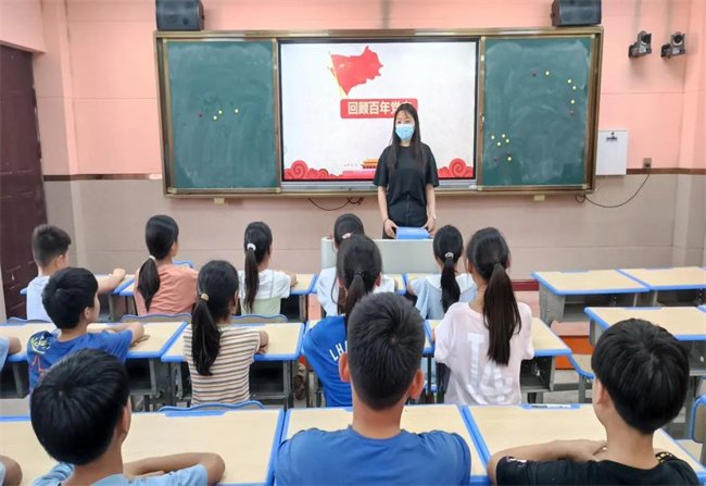 實(shí)踐活動(dòng)中,團(tuán)隊(duì)成員走進(jìn)校園、走進(jìn)課堂,通過(guò)回顧百年黨史,引出紅色革命故事,激發(fā)學(xué)生學(xué)習(xí)興趣。在課堂上,團(tuán)隊(duì)成員組織學(xué)生觀看紅色影片,開(kāi)展“角色扮演講黨史”“你畫(huà)我猜”等小游戲,將黨史知識(shí)融入游戲,使學(xué)生們?cè)谕嫠V屑由顚?duì)黨史知識(shí)的學(xué)習(xí)。最后,團(tuán)隊(duì)成員號(hào)召學(xué)生一起向黨敬禮,獻(xiàn)禮七一,實(shí)踐活動(dòng)在歡聲笑語(yǔ)中落下帷幕。