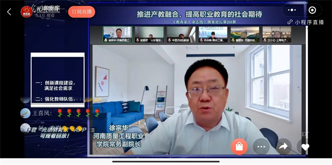 近日,河南質(zhì)量工程職業(yè)學(xué)院常務(wù)副院長徐宗華受光明日?qǐng)?bào)《教育家》雜志編輯部的邀請(qǐng),參加了《教育家》雜志線上圓桌論壇,論壇主題為“推進(jìn)產(chǎn)教融合,提高職業(yè)教育的社會(huì)期待”。本次圓桌論壇共邀請(qǐng)廣西中醫(yī)藥大學(xué)、上海電子信息職業(yè)技術(shù)學(xué)院等全國各地職業(yè)院校的6名專家圍繞“創(chuàng)新課程建設(shè),滿足社會(huì)需求”“強(qiáng)化教師隊(duì)伍,持續(xù)提高教育質(zhì)量”“完善融合機(jī)制,建構(gòu)良性生態(tài)”三項(xiàng)議題進(jìn)行了深入探討。