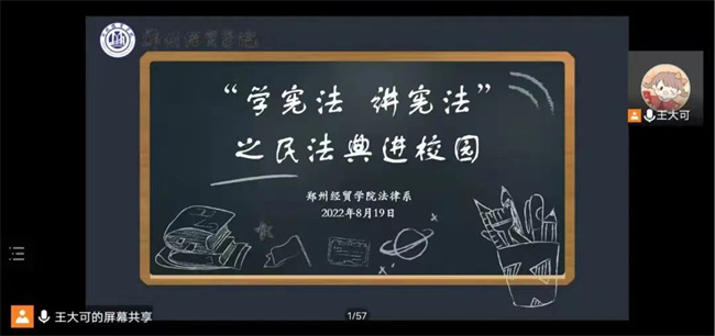 中新河南網(wǎng)8月21日電(宋薇薇) 為扎實推進(jìn)第七屆全省學(xué)生“學(xué)憲法、講憲法“活動,開展校園法制教育,鄭州經(jīng)貿(mào)學(xué)院于8月19日上午,通過線上直播的方式開展“學(xué)憲法、講憲法“之民法典進(jìn)校園主題講座,引導(dǎo)同學(xué)們筑牢中華民族共同體意識,樹立和鞏固國家安全、誠實守信、規(guī)則意識,了解及掌握相關(guān)法律知識和技能。講座由學(xué)校“學(xué)生心目中的好老師”、法律系教師王琦主講。