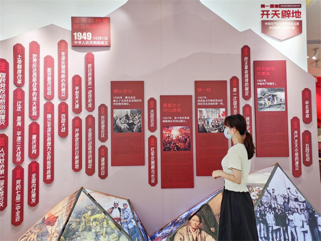 圖為實踐團成員通過展廳豐富詳實的文字、圖片、視頻及實物介紹,重溫中國共產(chǎn)黨近百年來波瀾壯闊的光輝歲月。