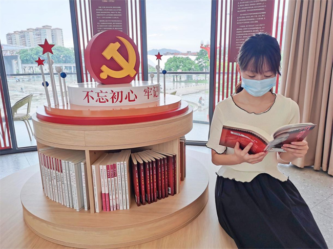 圖為實踐團成員在林村黨史學(xué)習(xí)主題館二樓黨史學(xué)習(xí)室閱覽黨史、村史圖書。