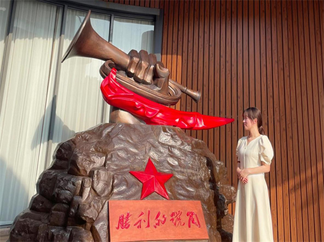 圖為實踐團成員在“勝利的號角”模型前觀摩。王心雨 供圖