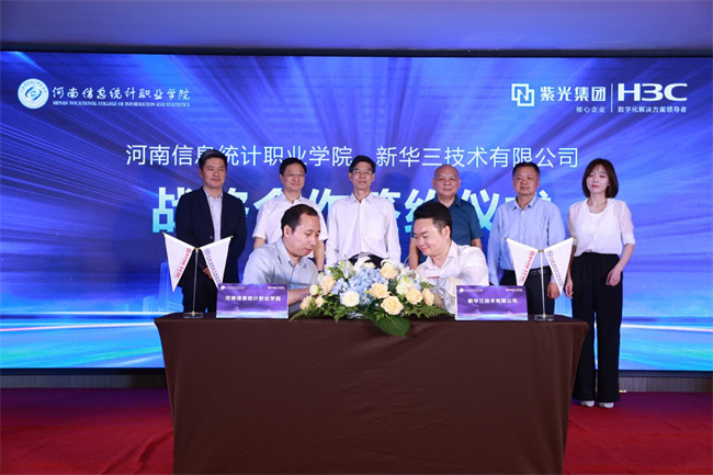 宗方、汪衛(wèi)國(guó)分別代表河南信息統(tǒng)計(jì)職業(yè)學(xué)院和新華三技術(shù)有限公司簽署校企戰(zhàn)略合作協(xié)議。