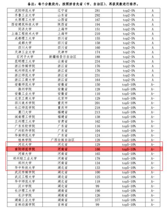 中新河南網(wǎng)9月8日電(杜志豪 師書(shū)魁) 日前,中國(guó)高等教育學(xué)會(huì)“高校競(jìng)賽評(píng)估與管理體系研究”專家工作組對(duì)藝術(shù)類競(jìng)賽指數(shù)進(jìn)行分析發(fā)布。首輪藝術(shù)類競(jìng)賽指數(shù)覆蓋的本科院校為1098所,南陽(yáng)師范學(xué)院榮獲A-等級(jí)(綜合排名全國(guó)前5%-10%),在河南省高校中排名第一。