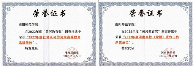 中新河南網(wǎng)9月10日電 近日,由河南日報社主辦的第十三屆“黃河教育論壇”暨“2022年度黃河教育獎”評選活動結果揭曉,南陽師范學院獲評“2022年度社會認可的河南高等教育品牌院校”和“2022年度河南高校(黨建)宣傳工作示范單位”。