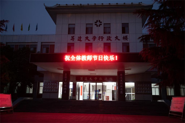 線下,9月8日至9月12日,學校在校內行政樓、圖書館、體育館等多處標志性建筑的電子顯示屏上,通過字幕滾動的方式深情道出“迎接黨的二十大,培根鑄魂育新人”“熱烈慶祝第38個教師節(jié)”“老師,您辛苦了!”“祝全體教師節(jié)日快樂!”“賡續(xù)百年初心,擔當育人使命”“講臺能載千秋偉業(yè),燭光亦照萬里河山”等祝福語。這些熱忱的話語,既表達了對教師們的崇高敬意和真誠祝福,也給整個校園營造出一片濃厚的節(jié)日氛圍,引導學生感念師恩、禮敬老師。線上,從9月5日開始全校師生積極參與由中國教師發(fā)展基金會主辦的“感謝師恩 為教師亮燈”活動。師生們深情追憶求學路上老師們的諄諄教誨,感謝老師們的培育之恩,紛紛點亮感恩之光,為老師們送上真摯的祝福。