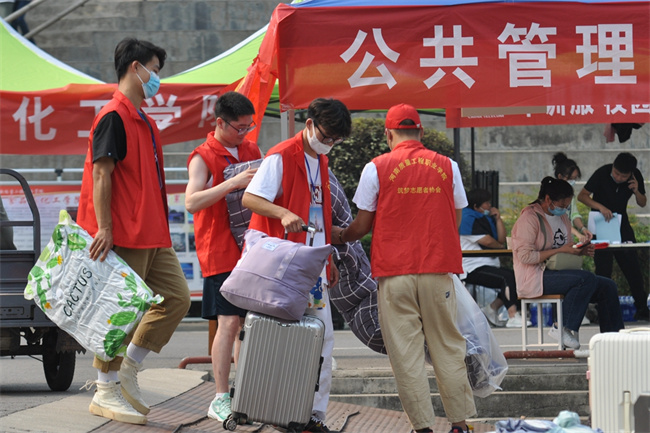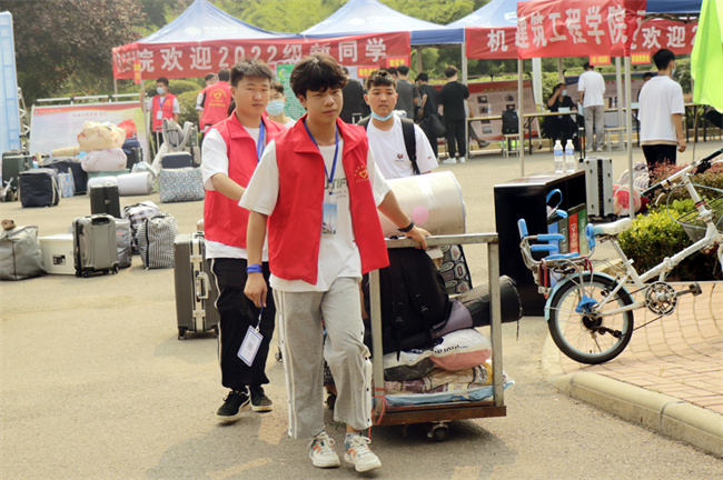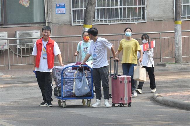 為便于新生報到,學院采用“一條龍”全過程服務(wù),接站、報到、入住全程都有工作人員和師生志愿者的指引協(xié)助,各環(huán)節(jié)有效銜接。在火車站、高鐵站、汽車站,院團委老師、學生志愿者早早到位,迎接新生。在學院大門口,學院嚴格出入管理,守好新生報到入校疫情防控線,保衛(wèi)處、后勤處工作人員仔細查驗進校新生的核酸檢測報告、健康碼等,并做好身份核驗、體溫檢測、行李消殺;同時安排專人進行疏導,避免交通擁堵,保障交通秩序。進入校園,校內(nèi)志愿者為新同學耐心指路、講解注意事項、辦理報到手續(xù),利用電動車輛、手推車搬運行李,努力做到全程服務(wù);現(xiàn)場工作人員認真組織協(xié)調(diào),循環(huán)運轉(zhuǎn),保證了迎新工作的順利開展。陽光下,被汗水浸透的紅色馬甲是校園里最靚麗的風景線。學院還在校園里設(shè)置咨詢臺,提供綠色通道、學籍咨詢、醫(yī)療救護等服務(wù),迎新工作井然有序、暖心高效。