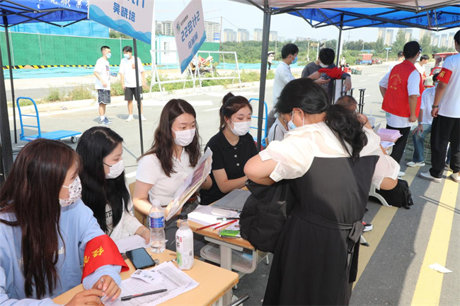 新生經(jīng)過測溫、掃碼、消殺等系列流程進入學校。校內(nèi)設(shè)置核酸檢測點,第一時間為到校新生提供核酸檢測服務(wù)。