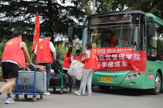 “挺方便的,從大門口行李就貼上了便簽,我隨身帶著手機(jī)和證件就可以啦,志愿者和擺渡車會(huì)直接運(yùn)到宿舍門口”來自南陽的新生張同學(xué)說。據(jù)悉,學(xué)校共有20臺(tái)大巴車、5臺(tái)電瓶車、15臺(tái)平板車投入行李轉(zhuǎn)運(yùn),現(xiàn)場服務(wù)的學(xué)生志愿者兩千余人。