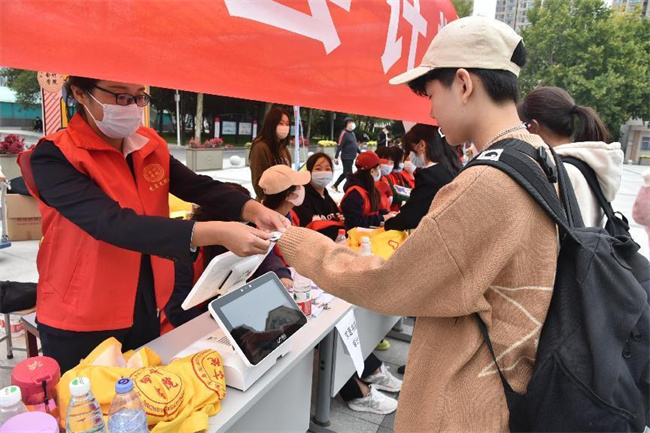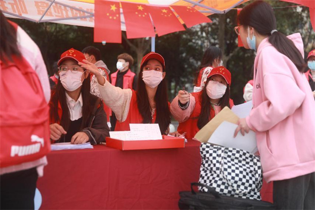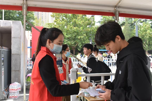 志愿者引導(dǎo)新生測溫、檢查健康碼、核驗(yàn)身份信息、核酸檢測