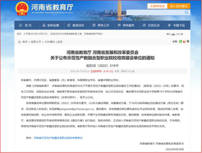 中新河南網(wǎng)10月13日電(李安杰) 近日,根據(jù)《河南省教育廳河南省發(fā)展和改革委員會關于開展示范性產(chǎn)教融合型職業(yè)院校建設工作的通知》(教職成〔2022〕20號)的要求,省教育廳聯(lián)合省發(fā)改委組織專家綜合評審,經(jīng)公示無異議后,確定19個學校為河南省示范性產(chǎn)教融合型職業(yè)院校培育單位,鄭州電力高等?茖W校成功入選,為14所獲批示范性產(chǎn)教融合型高職院校培育單位之一。