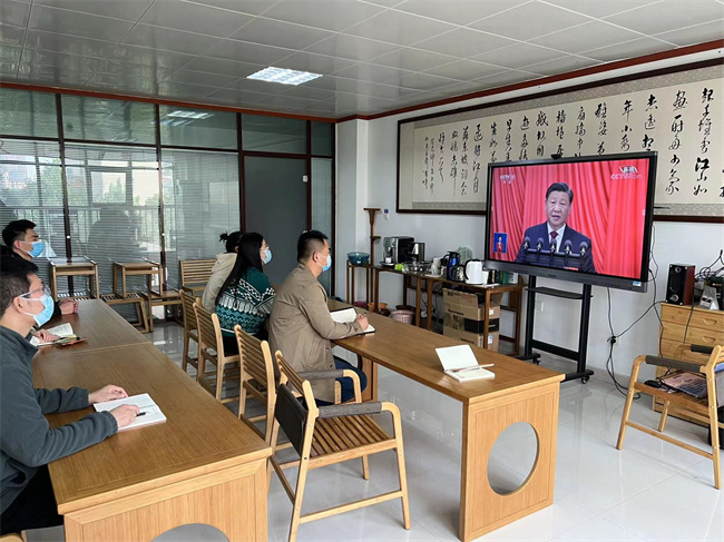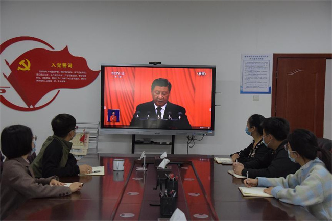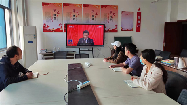 在學院418會議室,黨委書記王霄鸝、院長程慎帶領在校值班值守的中層以上干部集體收看黨的二十大開幕實況。