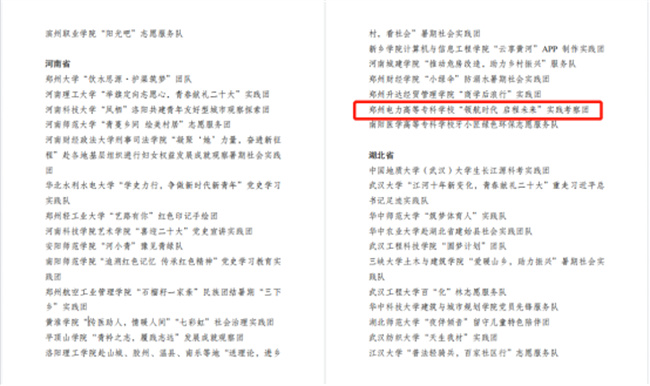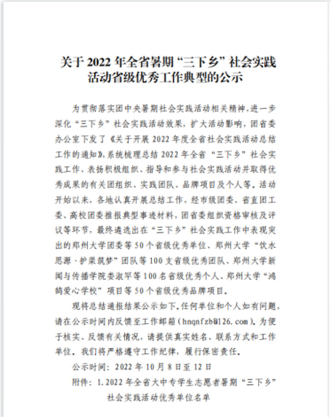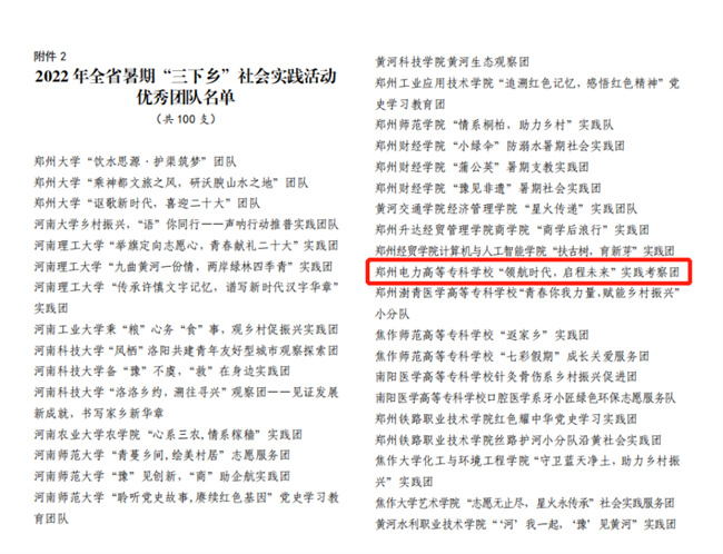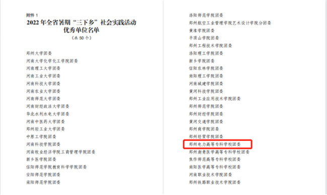 中新河南網(wǎng)10月21日電(李安杰) 近日,共青團(tuán)中央對2022年全國大中專學(xué)生志愿者暑期文化科技衛(wèi)生“三下鄉(xiāng)”社會實(shí)踐活動中表現(xiàn)突出的優(yōu)秀集體和個人進(jìn)行了通報表彰。經(jīng)學(xué)校團(tuán)委層層推報,“領(lǐng)航時代 啟程未來”實(shí)踐考察團(tuán)(鄭州電力高等?茖W(xué)校電氣工程學(xué)院)榮獲2022年全國“三下鄉(xiāng)”社會實(shí)踐“優(yōu)秀團(tuán)隊(duì)”榮譽(yù)稱號(全省共20個團(tuán)隊(duì)入選,其中專科院校僅兩個),是繼學(xué)校團(tuán)委獲得全國“三下鄉(xiāng)”社會實(shí)踐“優(yōu)秀單位”之后,再次受到共青團(tuán)中央的表彰!
