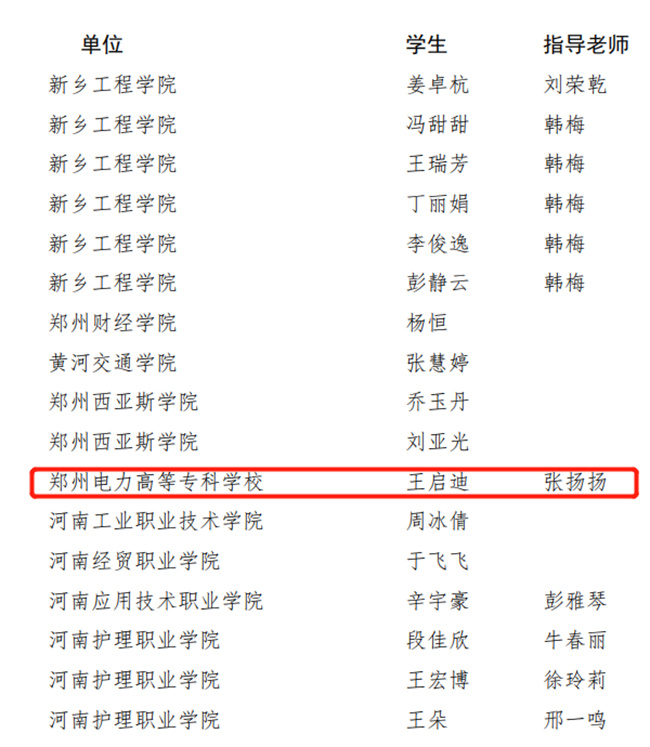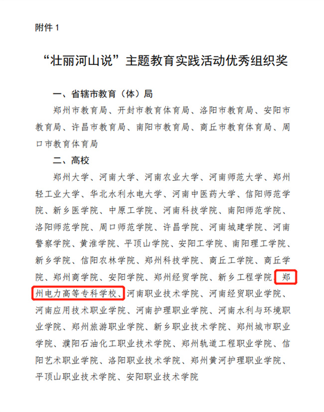 中新河南網(wǎng)10月23日電(王瑛潔) 近日,中共河南省委教育工委辦公室、河南省教育廳辦公室下發(fā)《關于公布“壯麗河山說”主題教育實踐活動獲獎結果的通知》,鄭州電力高等?茖W校榮獲“優(yōu)秀組織獎”,“先進個人獎”、“人氣之星獎”、“優(yōu)秀指導教師”各有1人獲得。