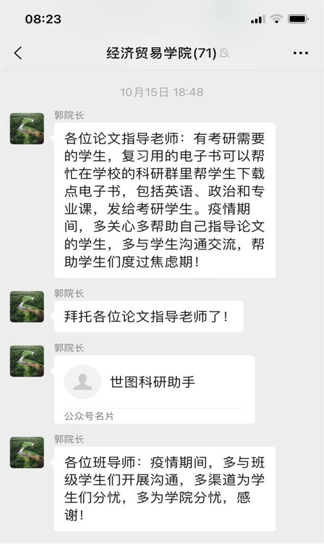 由于疫情來(lái)勢(shì)兇猛,讓相當(dāng)一部分同學(xué)措手不及,未能及時(shí)收拾學(xué)習(xí)資料,許多學(xué)生的學(xué)習(xí)資料都落在了圖書(shū)館、教學(xué)樓等處。院長(zhǎng)郭凱在關(guān)心住校老師們的同時(shí),迅速組織所有班導(dǎo)師和論文指導(dǎo)教師,要求線上對(duì)同學(xué)們尤其是考研學(xué)生進(jìn)行針對(duì)性的專業(yè)指導(dǎo)。針對(duì)考研同學(xué)學(xué)習(xí)資料不在宿舍的情況,郭院長(zhǎng)為同學(xué)們提供了多種獲得電子資料的渠道,緩解考研同學(xué)的焦慮情緒。
