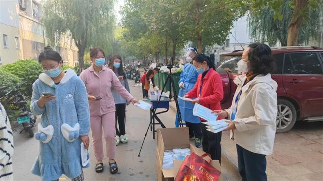 管理學(xué)院院長郭琰、黨總支書記韋菲在核酸檢測現(xiàn)場為學(xué)生發(fā)放防疫物資