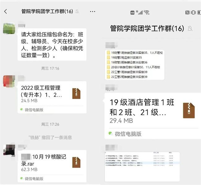 零報告和核酸檢測是做好疫情防控工作的重要一環(huán),為了讓同學(xué)們更深刻地認(rèn)識到打卡的重要性,輔導(dǎo)員老師們從未打卡同學(xué)、打卡截止時間、監(jiān)督打卡的班委、輔導(dǎo)員自身等不同角度出發(fā),每天盡可能用不同的方式通知或提醒學(xué)生按時進(jìn)行核酸檢測和健康打卡。健康日報保持實時跟蹤,學(xué)生中的集中健康監(jiān)測人數(shù)、校外隔離人數(shù)、未返校人數(shù)……每位輔導(dǎo)員老師對自己所帶的學(xué)生全部了然于胸,以高度的責(zé)任心和強(qiáng)烈的使命感,做好防疫摸排和服務(wù)工作。
