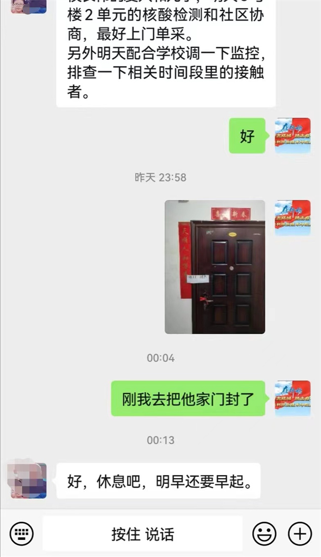 忙完這些,高老師回到辦公室,還沒來得及喘口氣,這時他的手機鈴聲就開始不斷響起。“高老師,我在網(wǎng)上訂的菜,您給看看送到大門口了嗎?”“高老師,我下午沒課,可以去當志愿者,您給安排一下!”“高老師,家里老人的藥不能斷,如果送的藥到了,請您給安排送一下。”“高老師,家人今天出院回家,您幫忙給社區(qū)協(xié)調一下,咋回來呀?”……這樣的電話,他每天能接100多個。除了電話,他還得在微信群里及時發(fā)核酸檢測信息、防控要求,回復老師及家屬的各種問題。用他的話說:“一有空,我就得給手機充上電,身上帶塊充電寶,防止手機沒電了耽誤大家的事。大家都按要求足不出戶,我得努力做好這1200多戶的服務工作,盡全力保障大家的正常生活。”