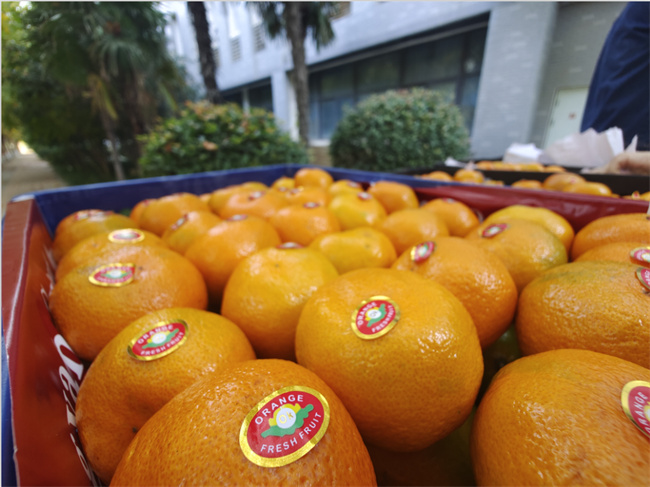 粉紅的蘋果、亮橙橙的蜜桔……一箱箱滿載著溫暖的“愛心”水果,被一份份的派送到了同學(xué)們的手中。
