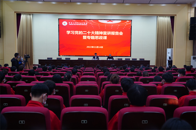 溫道軍以《學(xué)思踐悟凝心鑄魂 踔厲奮發(fā)勇毅前行》為題,從“深刻認(rèn)識黨的二十大的重大歷史意義、牢牢把握新時代十年的偉大變革、深入學(xué)習(xí)二十大報告的創(chuàng)新理論、緊緊錨定新時代職業(yè)教育發(fā)展目標(biāo)、堅決扛起新時代新征程的歷史使命”五個方面入手,闡述了黨的二十大的重大意義,全面解讀了二十大報告,講解了過去五年工作和新時代十年的偉大變革,重點結(jié)合了報告中與教育、科技、人才等相關(guān)的論述,分析了學(xué)校發(fā)展面臨的機遇挑戰(zhàn),進一步明確重點任務(wù)舉措,對青年一代為青春理想而拼搏奮斗提出了殷殷囑托和期望。