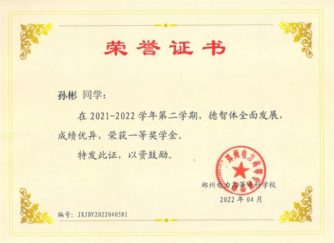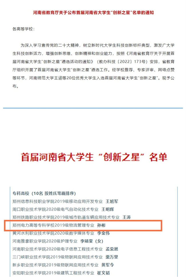 孫彬,鄭州電力高等?茖W(xué)校經(jīng)濟(jì)管理學(xué)院2022屆物流管理專業(yè)畢業(yè)生,現(xiàn)就職于河南九域恩湃電力技術(shù)有限公司。2022年11月獲評(píng)首屆河南省大學(xué)生“創(chuàng)新之星”