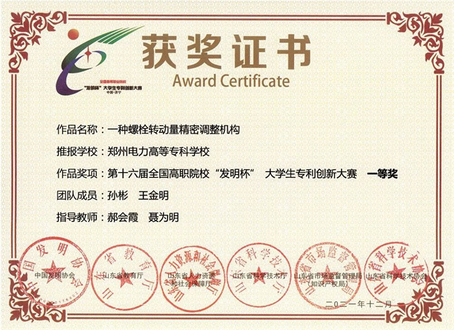 獲得第十六屆全國高職院校“發(fā)明杯”專利創(chuàng)新大賽國賽一等獎(jiǎng)(排名第一)