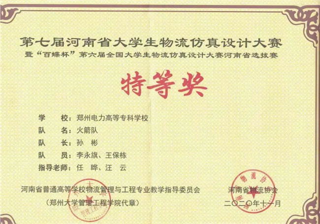 第七屆河南省大學(xué)生物流仿真設(shè)計(jì)大賽(團(tuán)體賽)特等獎(jiǎng)(排名第一)
