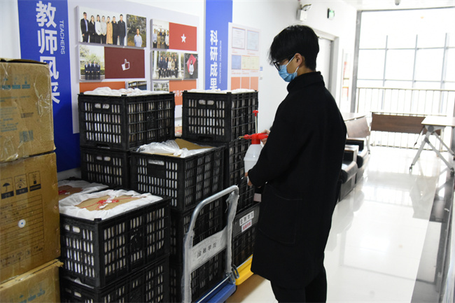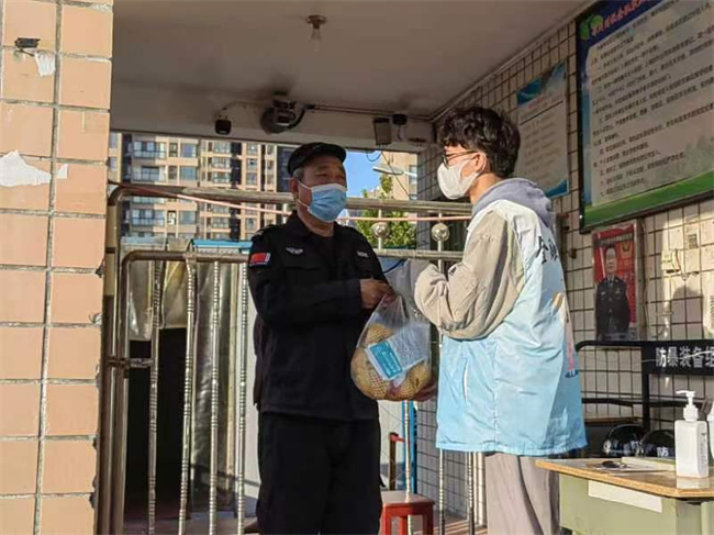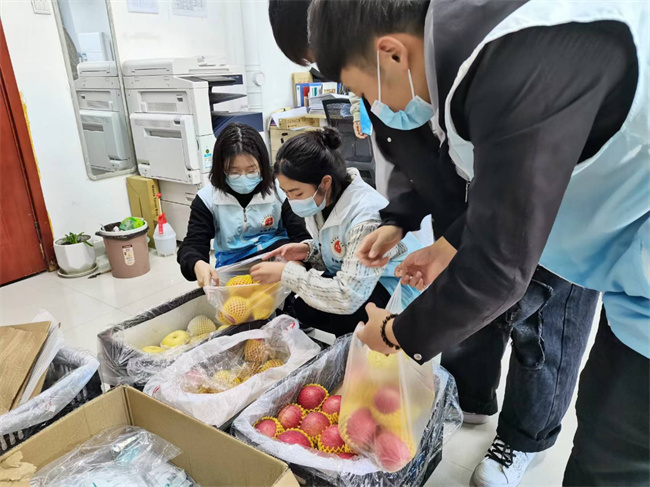 在經(jīng)過(guò)嚴(yán)格的消殺處理后,小金寶志愿者們對(duì)口罩和水果進(jìn)行分類裝袋,及時(shí)送到在校師生和后勤保障工作人員手中,向更多工作人員傳遞溫暖與關(guān)愛。