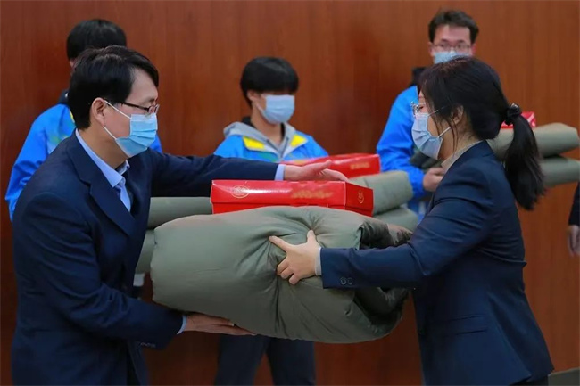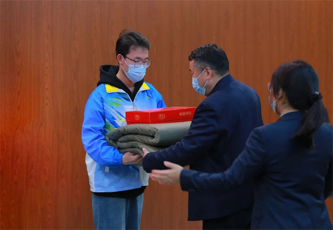 首先,學生處(學生資助中心)副處長介紹了今年冬季學校在克服疫情防控期間物質緊缺、快遞困難的壓力下,共向學校500名家庭經(jīng)濟困難學生發(fā)放御寒的保暖衣243套,棉被257條的基本情況。