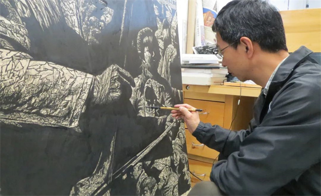 版畫不僅是個(gè)“腦力活”還是個(gè)“體力活”,每一次創(chuàng)作,對(duì)郝彥杰這樣的“熟手”來(lái)說(shuō),也是一次大挑戰(zhàn),“下刀的輕重、疏密都直接影響到版畫最終呈現(xiàn)的效果,馬街藝人系列,每一幅的創(chuàng)作過(guò)程都在一個(gè)學(xué)期左右。非?简(yàn)?zāi)托暮图?xì)心。”