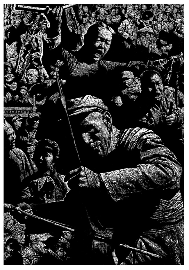 經(jīng)過(guò)反復(fù)推敲,2013年,郝彥杰的《應(yīng)河亮?xí)弧钒娈嬜髌窇?yīng)運(yùn)而生,該作品采用黑白木刻,在一群人中重點(diǎn)刻畫了十多個(gè)表演者的形象,把書會(huì)的熱鬧、藝人們傾情獻(xiàn)藝的表演姿態(tài)、觀看者如癡如醉的神態(tài),刻畫的淋漓盡致。