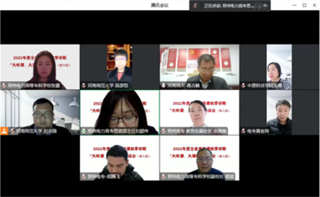 根據(jù)工作安排,專家組首先隨機抽取學校三位教師的課程,采用騰訊會議線上聽課的方式深入學校思政課課堂,分別于11月21日、22日聽取了黃克非、張露兩位老師的《習近平新時代中國特色社會主義思想概論》課程和胡騰飛老師的《思想道德與法治》課程。11月29日下午,通過騰訊會議召開了座談會。調研組組長、河南師范大學馬克思主義學院院長蔣占峰、調研組成員苗彥愷、朱媛、劉永強,鄭州電力高專副校長胡斌、教務處副處長宗海煥、思政部主任劉穎偉及3位教師代表參加了座談。