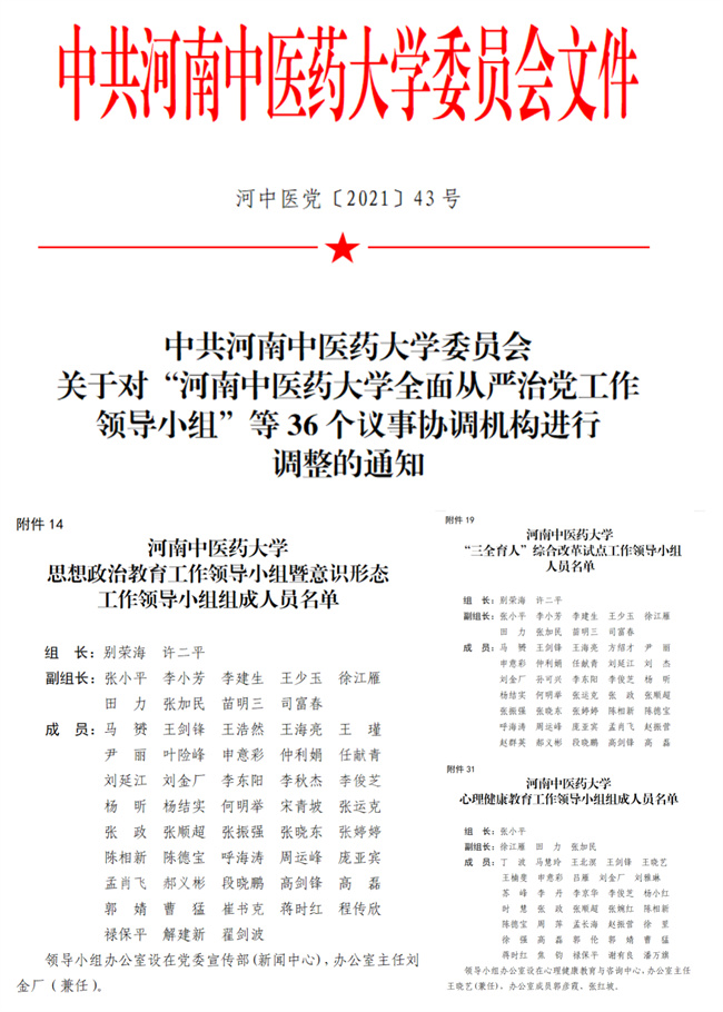 (一)強化組織領(lǐng)導(dǎo),堅定“主心骨”。校黨委扛牢為黨育人、為國育才的使命擔(dān)當(dāng),不斷提高政治站位,增強行動自覺。學(xué)校成立有黨委書記、校長任組長,主管副書記任常務(wù)副組長,其他校領(lǐng)導(dǎo)任副組長,各部門各單位負責(zé)人為成員的思想政治教育工作領(lǐng)導(dǎo)小組。根據(jù)形勢任務(wù)需要,及時成立三全育人、中醫(yī)藥特色文化建設(shè)、心理健康教育、立德樹人等工作領(lǐng)導(dǎo)小組,不斷拓展工作領(lǐng)域,統(tǒng)籌育人力量,構(gòu)建了黨委統(tǒng)一領(lǐng)導(dǎo)、黨政齊抓共管、職能部門協(xié)同推動、基層學(xué)院(書院)積極落實的常態(tài)化與長效化工作機制。2018年,學(xué)校成為首批河南省“三全育人”綜合改革試點高校。