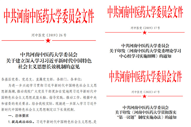 (二)強化思想引領(lǐng),點亮“指路燈”。學(xué)校黨委高舉思想之旗,把學(xué)懂弄通做實習(xí)近平新時代中國特色社會主義思想作為首要政治任務(wù),嚴格落實“第一議題”制度,充分發(fā)揮校處兩級黨委中心組理論學(xué)習(xí)的引領(lǐng)示范作用,及時跟進學(xué)習(xí)領(lǐng)悟習(xí)近平總書記重要講話和重要指示批示精神。2019年制定《關(guān)于建立深入學(xué)習(xí)習(xí)近平新時代中國特色社會主義思想長效機制的意見》《黨委理論學(xué)習(xí)中心組學(xué)習(xí)實施細則》,2022年出臺《貫徹落實“第一議題”制度實施辦法》,切實增強“四個意識”,堅定“四個自信”,做到“兩個維護”。黨委理論學(xué)習(xí)中心組聚焦習(xí)近平總書記關(guān)于高等教育和中醫(yī)藥發(fā)展的重要講話和重要指示批示精神,集中學(xué)習(xí)研討140次。黨委理論學(xué)習(xí)中心組成員堅持對標對表,強化學(xué)思踐悟,在黨報黨刊發(fā)表理論文章50余篇,撰寫心得體會500余篇。
