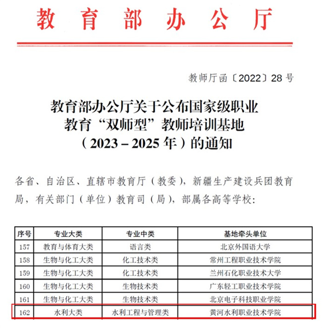 本次“雙師型”教師培訓基地遴選是深入貫徹黨的二十大精神,落實中共中央辦公廳、國務院辦公廳印發(fā)的《關于推動現(xiàn)代職業(yè)教育高質(zhì)量發(fā)展的意見》和《國務院關于印發(fā)國家職業(yè)教育改革實施方案的通知》要求,健全職業(yè)教育教師培訓機制,優(yōu)化教師培訓基地布局、推進職普融通、產(chǎn)教融合、科教融匯的重要舉措;氐某晒Λ@批,是教育部對黃河水利職業(yè)技術學院綜合辦學實力的充分肯定。該校將以入選國家級職業(yè)教育“雙師型”教師培訓基地為契機,充分利用成員院校的師資力量和教學資源優(yōu)勢、成員企業(yè)的技術研發(fā)和實踐資源優(yōu)勢,結合國家級職業(yè)教育教師教學創(chuàng)新團隊培訓基地、全國職業(yè)教育教師企業(yè)實踐基地,三基地協(xié)同發(fā)力,以服務經(jīng)濟社會發(fā)展、產(chǎn)業(yè)轉(zhuǎn)型升級和企業(yè)崗位高素質(zhì)技術技能人才需求為目標,提升教師的綜合能力和業(yè)務水平,引領職業(yè)院校教師、教材、教法“三教”改革,深化校企合作、校際協(xié)同,全面提升教師專業(yè)能力與思政能力并進,推進教育理論支撐綜合教學能力,提升實踐操作水平,不斷加強高素質(zhì)“雙師型”教師隊伍建設,為全面提高復合型技術技能人才培養(yǎng)質(zhì)量提供強有力的師資支撐,服務黃河流域生態(tài)保護和高質(zhì)量發(fā)展、南水北調(diào)后續(xù)工程高質(zhì)量發(fā)展等重大國家戰(zhàn)略,推動新階段水利事業(yè)高質(zhì)量發(fā)展。