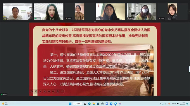 為扎實(shí)推進(jìn)憲法網(wǎng)絡(luò)學(xué)習(xí)和“憲法衛(wèi)士”行動(dòng)計(jì)劃,黨委宣傳部、團(tuán)委廣泛動(dòng)員,各學(xué)院(中心)精心部署,普法專干迅速行動(dòng),輔導(dǎo)員、班主任新建學(xué)生班級、導(dǎo)入學(xué)生信息,指導(dǎo)學(xué)生進(jìn)入教育部全國青少年普法網(wǎng)參與學(xué)習(xí)練習(xí)、綜合評價(jià)、法治實(shí)踐,并做好過程管理,實(shí)時(shí)掌握各班級完成情況和進(jìn)度,保質(zhì)保量完成學(xué)習(xí)與評價(jià)。同時(shí)各班級利用主題班會(huì)契機(jī),積極開展法治實(shí)踐活動(dòng),通過主題宣講、互動(dòng)討論、知識搶答、集體宣讀等形式使學(xué)生進(jìn)一步感受憲法文化,領(lǐng)會(huì)憲法精神。學(xué)校在普法網(wǎng)參與“憲法衛(wèi)士”2022行動(dòng)計(jì)劃學(xué)生用戶達(dá)19599人,平均得分82.96分,營造了濃厚的“學(xué)習(xí)憲法、尊崇憲法”的校園法治文化氛圍。