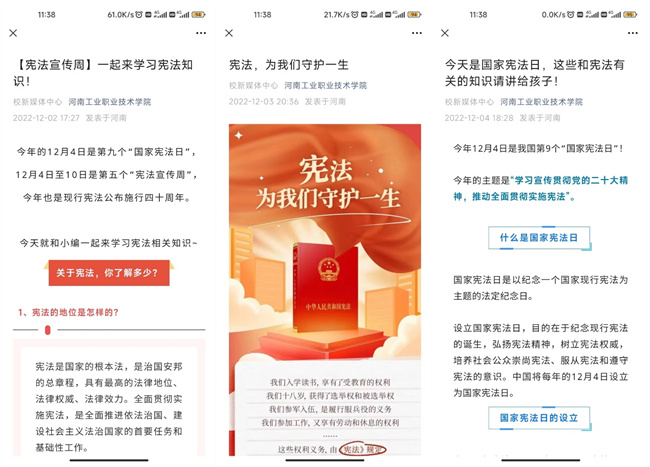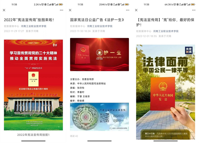 河南工業(yè)職業(yè)技術(shù)學(xué)院“憲法宣傳周”系列活動(dòng)的順利開展,營造了濃厚的“學(xué)習(xí)憲法、尊崇憲法”的校園法治文化氛圍,進(jìn)一步增強(qiáng)了廣大師生的法治觀念和法律意識,促進(jìn)了普法育人工作的順利開展,提升了河南工業(yè)職業(yè)技術(shù)學(xué)院依法治校能力。