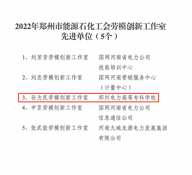 鄭州電力高等?茖W(xué)!皩O為民勞模創(chuàng)新工作室”獲批“鄭州市能源石化工會(huì)先進(jìn)勞模工作