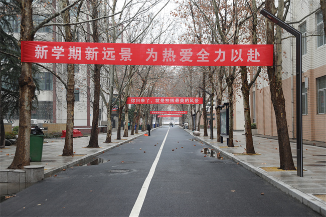 返校期間,為迎接久別重逢的學(xué)生們,該院領(lǐng)導(dǎo)班子成員提前到崗蒞臨現(xiàn)場(chǎng)指導(dǎo)工作,全體工作人員各司其職、相互協(xié)作,積極營(yíng)造安全穩(wěn)定、干凈整潔、溫馨舒適的校園環(huán)境氛圍。闊別已久的校園早已裝扮一新。道路兩旁懸掛著“新學(xué)期拍了拍你,‘歡迎回家’!”“回到宿舍,終于有陪你早睡早起了”等溫情滿(mǎn)滿(mǎn)的標(biāo)語(yǔ)……飽含著學(xué)校和老師們滿(mǎn)滿(mǎn)的愛(ài)意以及對(duì)學(xué)生們新學(xué)期的祝福。