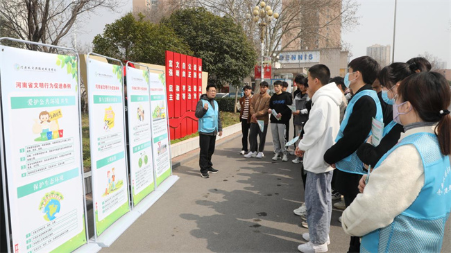 黨群黨總支黨員在校園主干道擺放《河南省文明行為促進條例》宣傳展幅,向青年學(xué)生宣講《河南省文明行為促進條例》具體內(nèi)容,深入校園操場、宿舍樓、教學(xué)樓等場所,發(fā)放《河南省文明行為促進條例》宣傳頁,并通過校內(nèi)電子屏播放宣傳標語,營造了濃厚的學(xué)習(xí)氛圍。